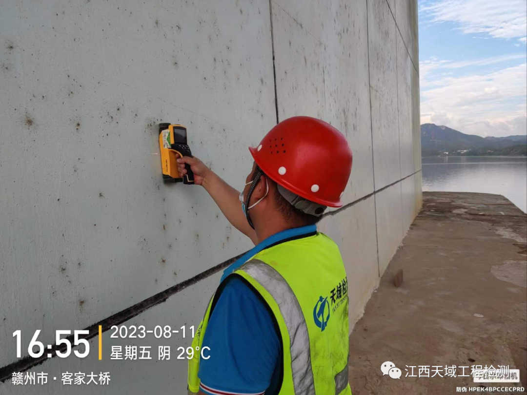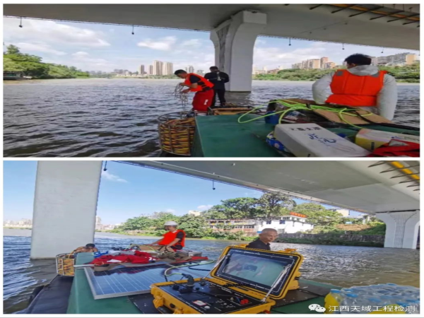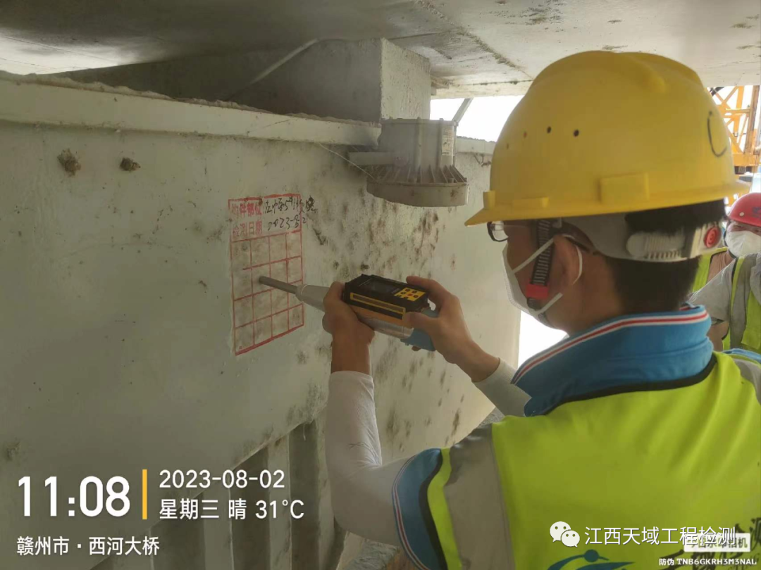 3个月来,公司派出专业检测团队对赣州中心城区8座桥梁上部结构、下部结构、桥面系及附属设施逐一进行外观检查、实体检测及防雷装置检测、全桥荷载试验。检测过程中,检测人员利用回弹仪、钢筋扫描仪、钢筋电位锈蚀仪、全站仪、水准仪、动态数据采集系统等多种高精度仪器智能软件,从桥面到主梁再到桥墩,不遗漏一处钢筋、一块混凝土、一个桥墩,对桥梁的上部结构、桥台、桥墩等技术状况进行全面检查并作出技术状况评定。检测工作采用了高空作业车、桥梁检测车、无人机等机械设备加以辅助,对桥梁基础水下桩部位的检查由专业潜水人员进行水下勘测。